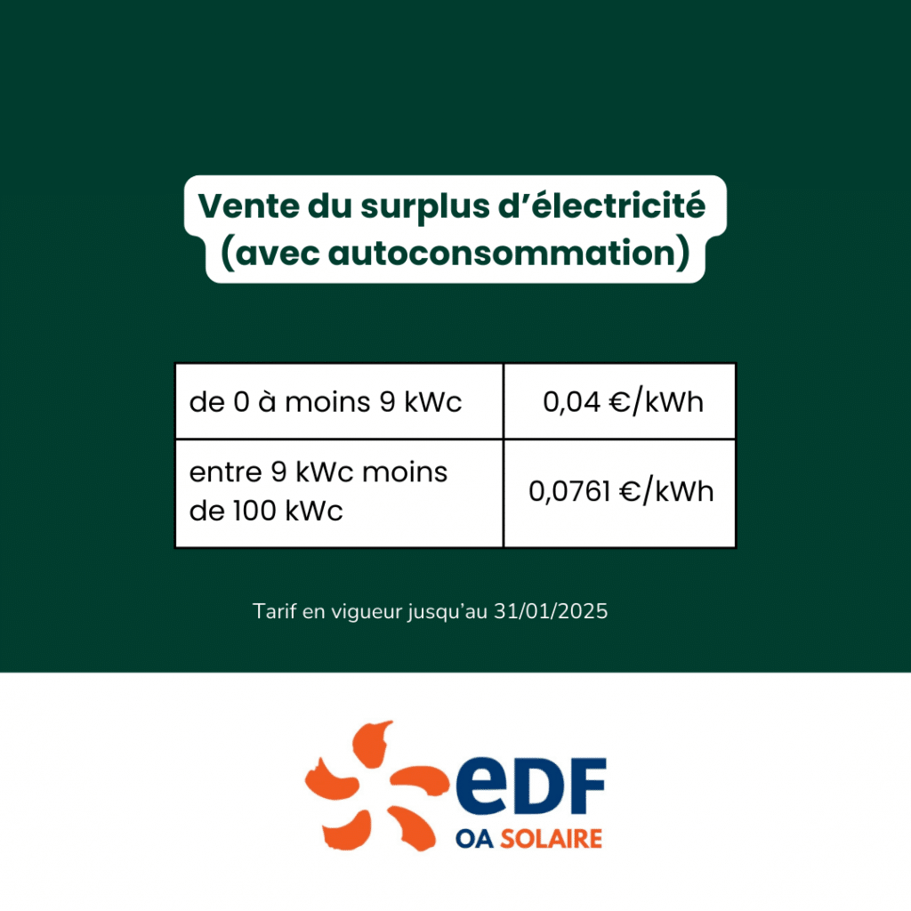 Vous pouvez vendre tout ou une partie de votre production d’électricité à des tarifs fixés par EDF. Pour une installation de 6 kWc, le tarif de rachat est de 4 centimes d’euros par kWh (en vigueur du 31 janvier 2025).